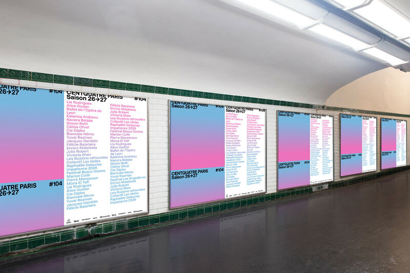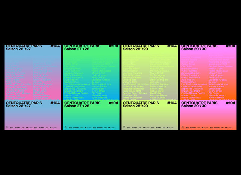 2025, Centquatre Paris. Proposition d'identité visuelle, affiches, programmes, signalétique, site internet, motion design, papeterie. Projet finaliste, non retenu. Avec Mia Thuault.