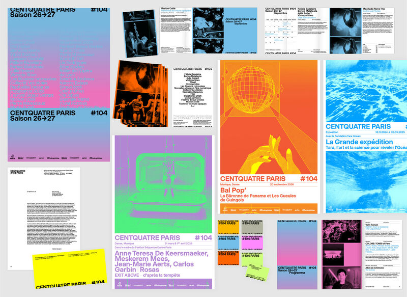 2025, Centquatre Paris. Proposition d'identité visuelle, affiches, programmes, signalétique, site internet, motion design, papeterie. Projet finaliste, non retenu. Avec Mia Thuault.